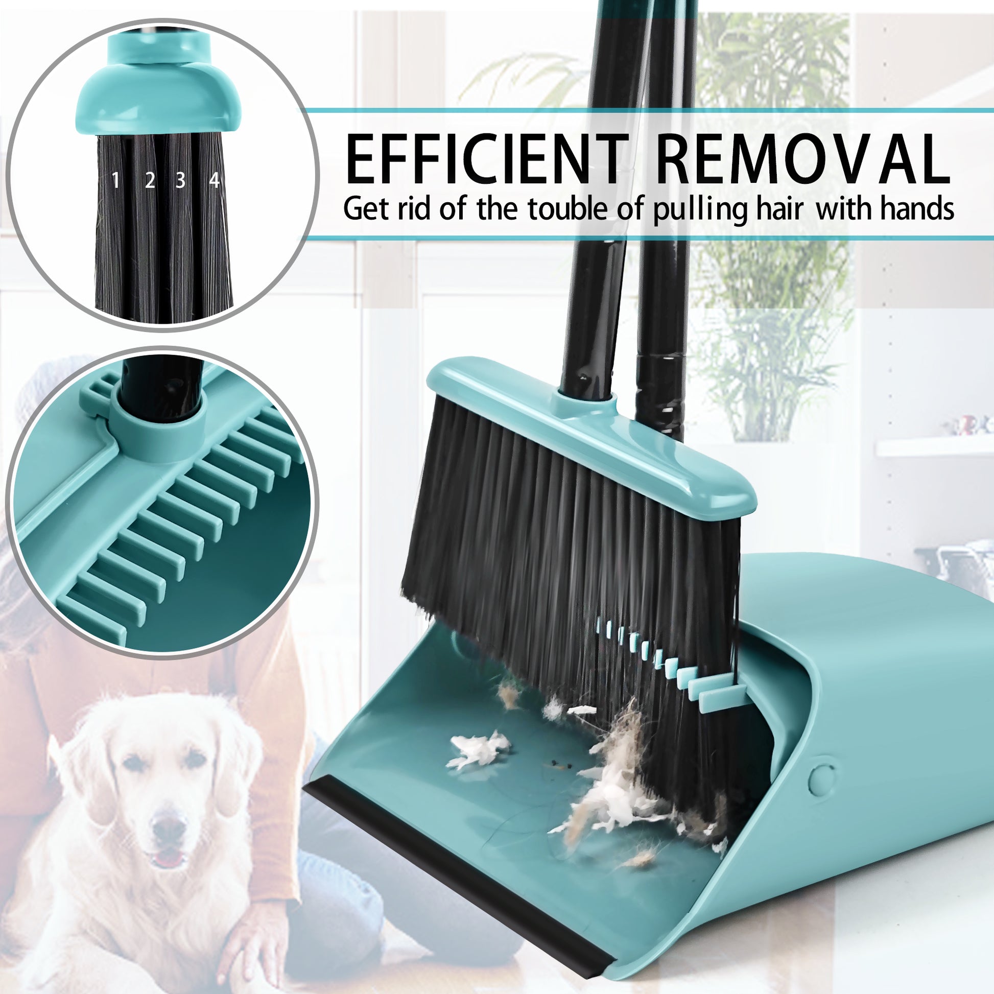 - KEEP YOUR HANDS CLEAN: The household brooms feature built-in comb teeth, ensuring dirt makes its way into the upright dustpan. No need to worry about polluting your hands to remove hairs (from yourself or your loving dog/cat) and other debris.