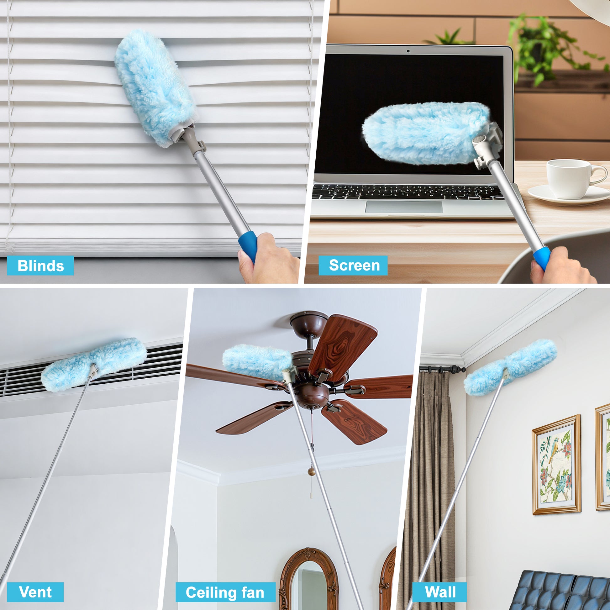 - Extendable Handle: This electrostatic duster with extension pole that stretches up to 6 feet, ideal for ceiling fans, blinds, light fixtures, bookshelves, vents, and high shelves without straining or using a ladder