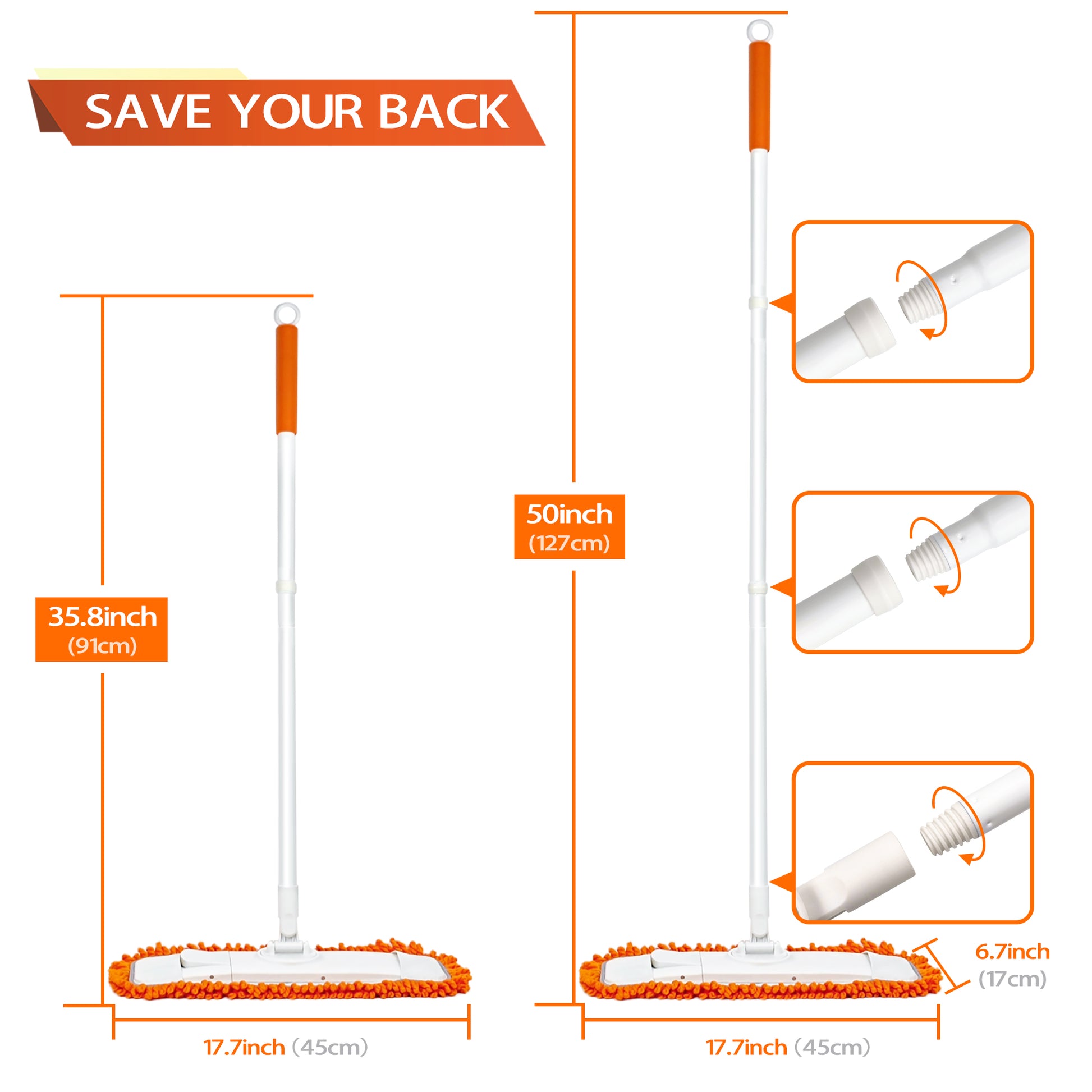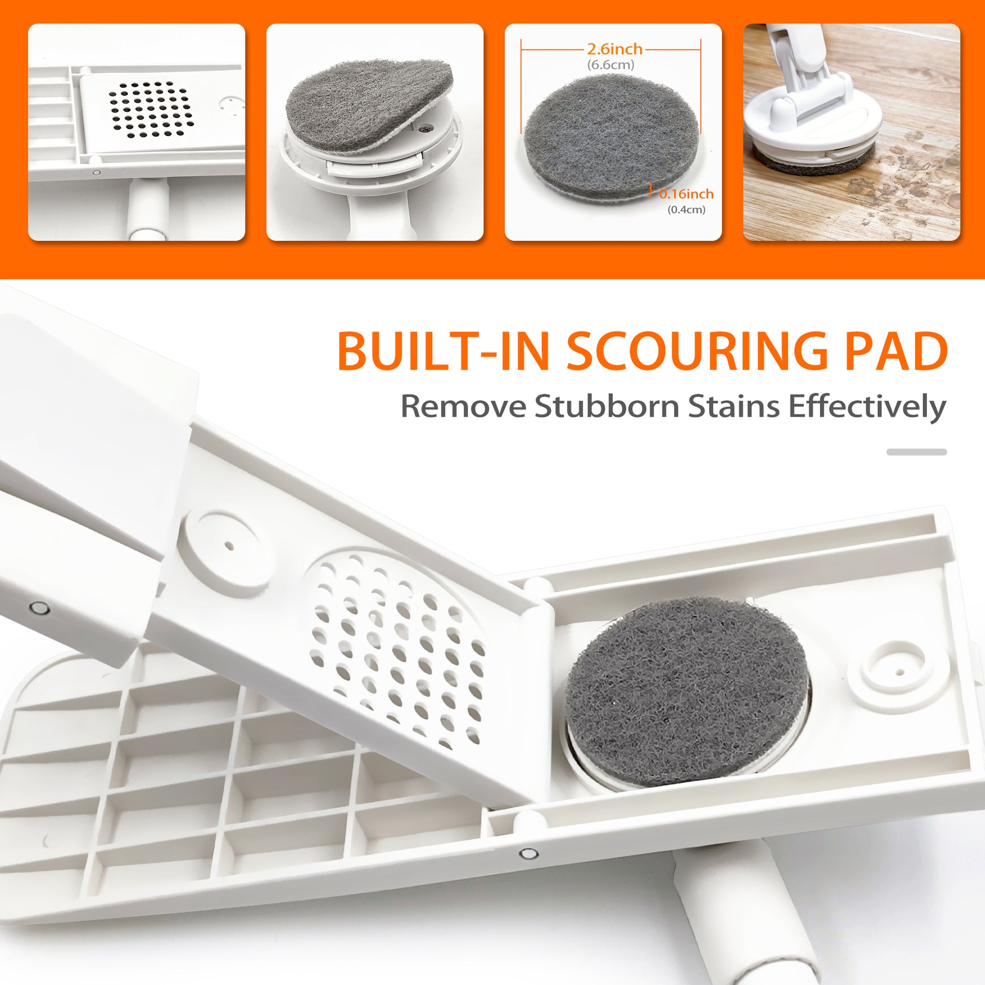 - BUILT-IN SCOURING PAD: The handle of this mop for wood floors can be adjusted from 35.8 inches to 50 inches. No need to bend over to clean. Besides, the attached scouring pad helps removing stubborn stain effectively.