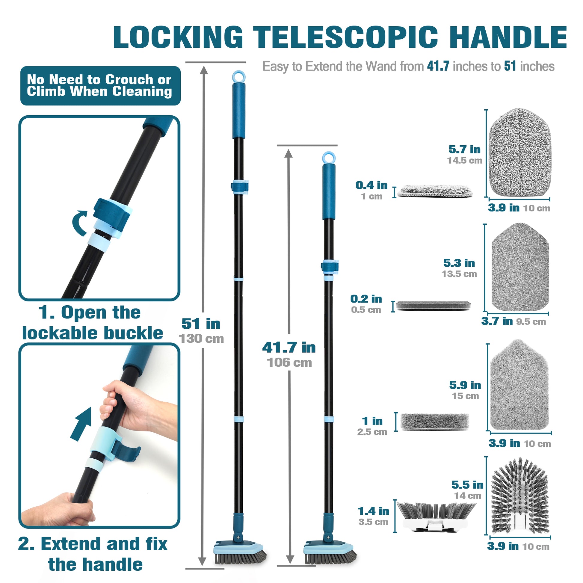 - Save Your Back: After pulling the trigger, you can adjust the length of the bathroom scrubber from 41.7 inches to 51 inches. No more bending or kneeling when doing housework. This shower scrubber with long handle keeps your kneel or back away from pain